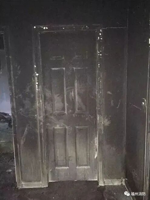 卧室门外侧:即靠近火源的一侧:墙壁和门已经完全被烟熏黑。